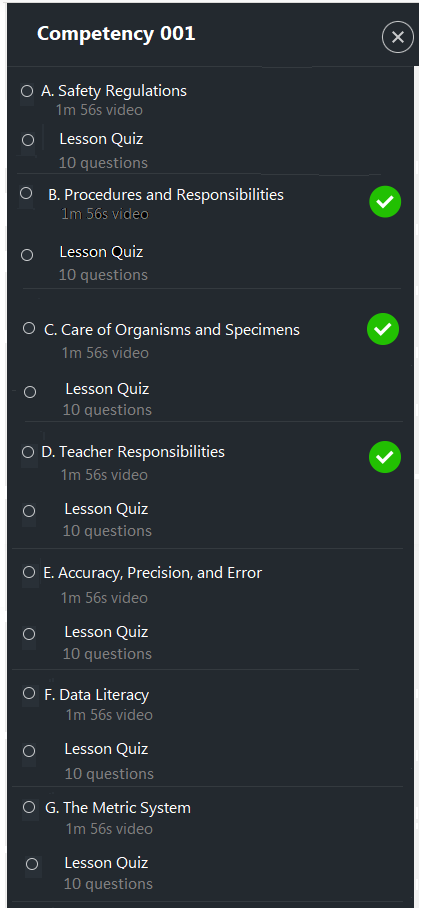 Every video lesson and quiz in the Study Guide is fully aligned with the exam’s domains and competencies. After you take an official full-length practice test, any competency where you score below 75% is added to your personalized Study Plan Tracker, which builds a targeted Study Guide focused only on what you need to improve. You’ll review those specific topics through short video lessons and quizzes. Once you’ve addressed the gaps, you’ll be ready to take another official full-length practice test and track your score improvement. Here’s the material included in the Study Guide.