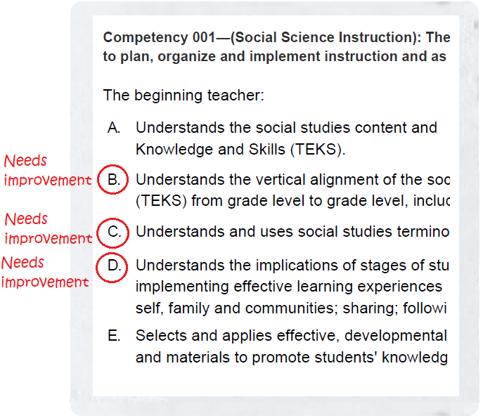 After taking a full-length TExES Core Subjects Social Studies (903) practice exam, Alice scored below 75% on Competency 001. The Smart Score Report pinpointed the issue: she answered every question related to Competency 001, descriptors B, C, and D incorrectly.